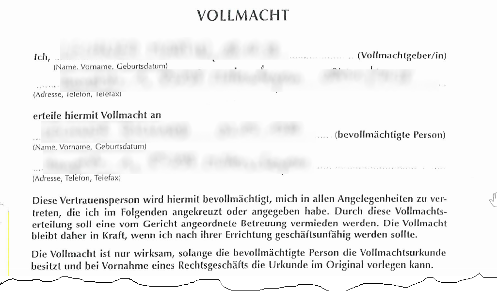 So kann die Vorsorgevollmacht schnell zur Enteignungsvollmacht werden. Hilfe gibt’s dann von den Behörden keine, nur ein “Die (Eltern) werden schon wissen, was sie unterschrieben haben”. Informieren Sie Ihre Angehörigen, dass es eine Vorsorgevollmacht gibt, wer diese verwaltet und wo diese Vollmacht aufbewahrt wird.